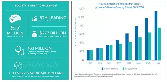 随着人均寿命延长,社会老龄化程度加剧,AD造成的社会负担可能会更加严重:如果不尽快开发出新的药物和疗法,到2050年,美国AD患者的总数预计将达到1380万,AD护理的直接成本将达到1.1万亿美元!如果能尽快开发一种新药,将AD的发病时间延迟五年,并在2025年就被批准使用的话,AD护理成本可以减少大约40%。因此,报告指出:“随着科学的进步,医生、立法者、患者代言人和行业领导者必须共同努力,确保我们为治疗做好准备。”