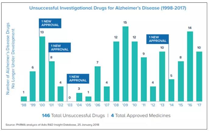 在1998年至2017年间,有146次不成功的尝试和4次成功。成功药物分别是Exelon(2000年,用于轻度至中度AD患者),Razadyne(2001年,用于轻度至中度AD患者),Namenda(2003年,用于中度至重度AD患者),Namzaric(2014年,用于中度至重度AD患者),加上之前的Aricept(1996年,用于各时期的AD患者),这些是为数不多的FDA批准用于AD的药物。