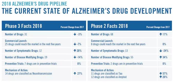 在2018年处于临床2期的药物有68种,其中有8种有潜力在未来5年中获批投放市场。这些药物中有13种是缓解症状的药物,55种是改变疾病进展的药物。以目标来看,有11种靶向tau蛋白,12种靶向淀粉样蛋白。