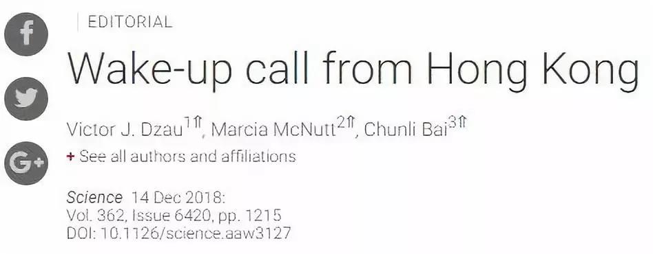 12月14日,中国科学院院长白春礼联合美国国家医学院院长Victor J. Dzau、美国国家科学院院长Marcia McNutt在《科学》上发表一篇题为《来自香港的警示》社论,呼吁全球各国科学院携起手来,就基因编辑研究及临床应用所应遵循的准则达成广泛的国际共识。