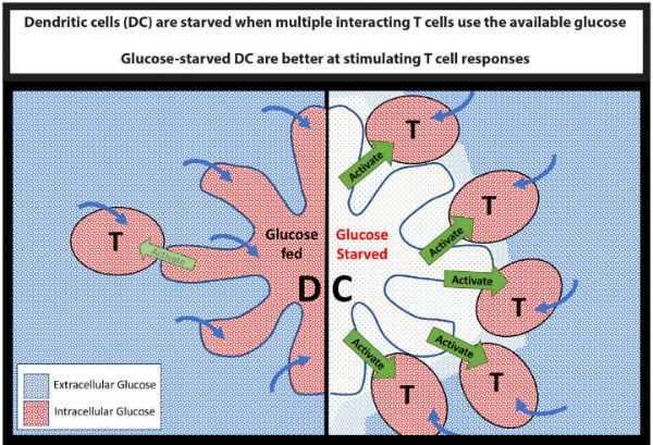 但是,这一最新研究却发现了不一样的现象:当负责监测危险信号的树状突细胞(dendritic cells)缺乏葡萄糖时,它们反而能够更好地刺激T淋巴细胞,行使免疫防御功能。