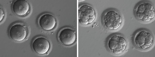 基因编辑前的新受精卵(左),以及基因编辑后,经过几轮细胞分裂的胚胎。 周三发表的一项研究表明,编辑人类胚胎的基因可以修复常见的严重致病基因突变。