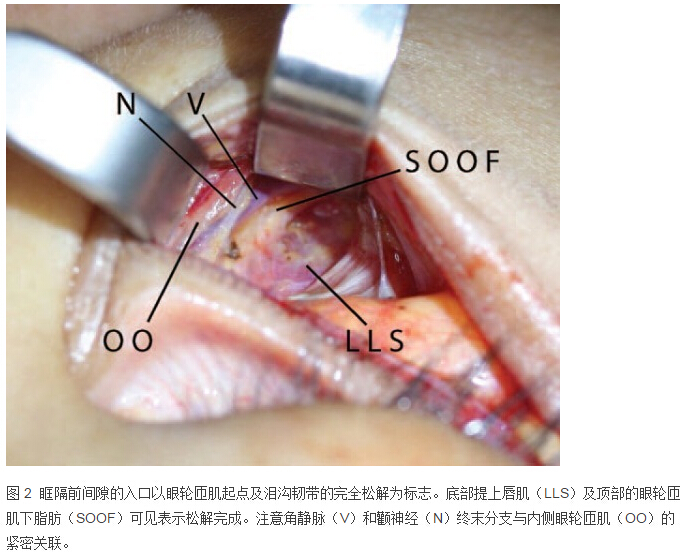 该研究回顾性分析了 2009 年 11 月到 2014 年 6 月期间 184 例手术。所纳入患者均经皮的下睑整形术切口分离进入眶隔前间隙;向内侧,连接对上颌前间隙的解剖,锐性分离对眼轮匝肌起点和泪沟韧带;向外侧,连接颧骨前间隙的解剖,释放眼轮匝肌的固有支持韧带 ( 见图 1,2)。