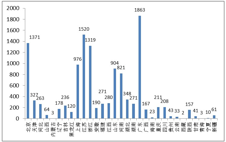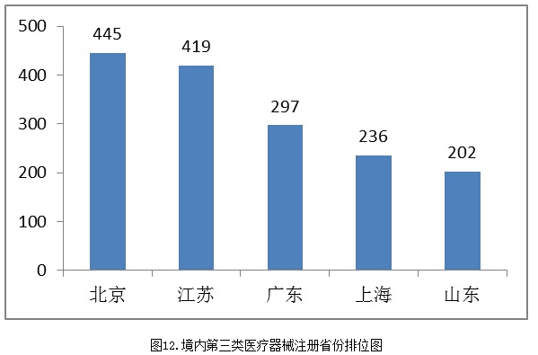 其中,北京、江苏、广东、上海、山东是境内第三类医疗器械注册数量最多的省份,占2015年境内第三类医疗器械首次、延续注册数量的67%。