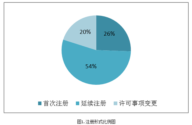 从注册形式看,首次注册申请1562项,占40%;延续注册申请1635项,占42%;许可事项变更注册申请724项,占18%。