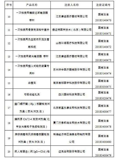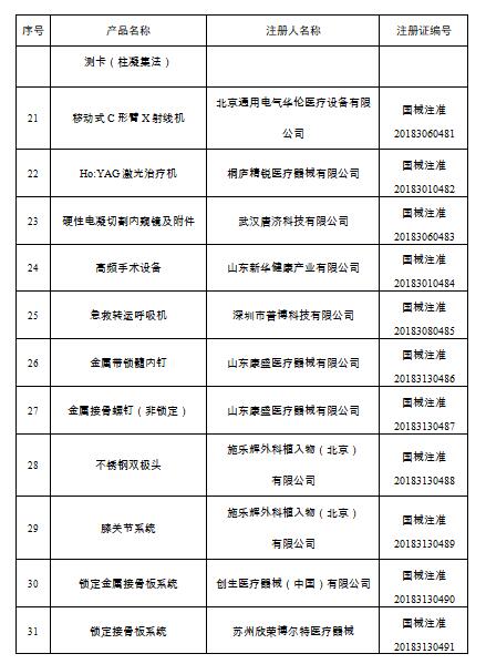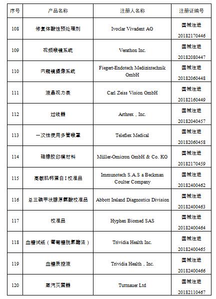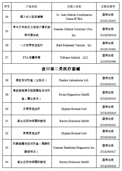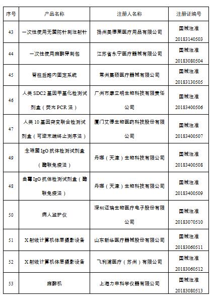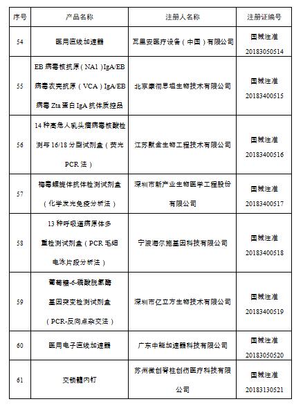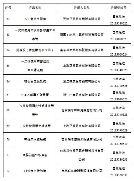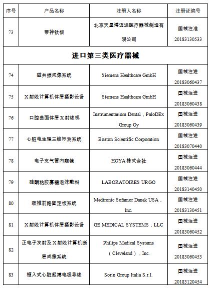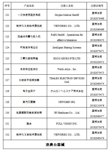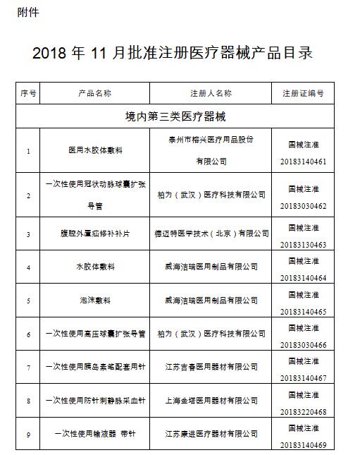 2018年11月,国家药品监督管理局共批准注册医疗器械产品133个。其中,境内第三类医疗器械产品73个,进口第三类医疗器械产品14个,进口第二类医疗器械产品45个,港澳台1个(具体产品见件)。